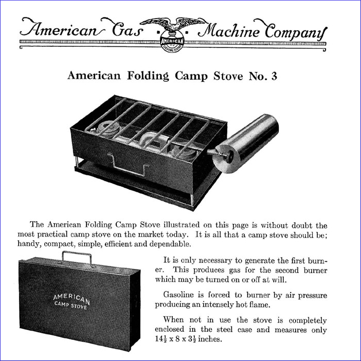 Kampkook stoves were produced by the American Gas Machine Company in response to the exploding recreation trend of cross country travel, exploration, and camping. It is hard to determine where the name KampKook originated from, several other companies used the term KampKook as a slang term to mean camping stove. I have seen Prentiss Webers Ads from the early 1900’s that also promote their own KampKook. Due to this it is hard to say what company, if any, started the KampKook term. Perhaps it was just something picked up by consumers and adopted by companies to capitalize on it, more definitive and ongoing research will help determine the answer.
